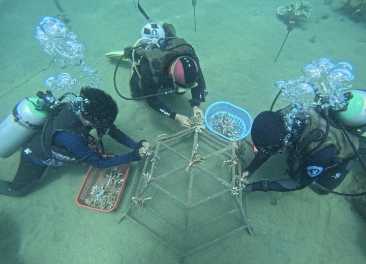 “Kami melakukan restorasi terumbu karang dengan dua metode modul yang berbeda yakni spider web dan umbrella web. Modul tersebut diletakan di sekitar kedalam 20 meter dari garis pantai dan ditanam dengan sejumlah 50 bibit terumbu karang,” kata Anwar Madea selaku Dive Instuctor di Spice Island Resort.